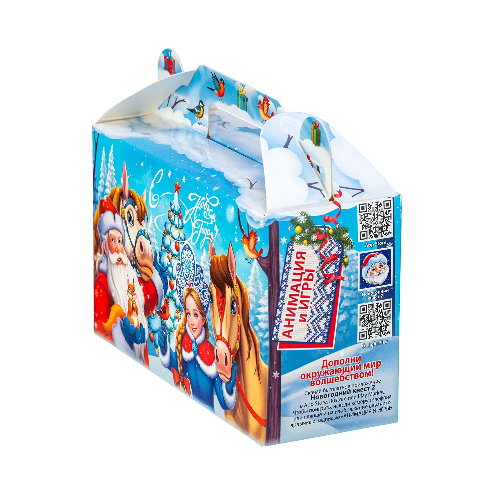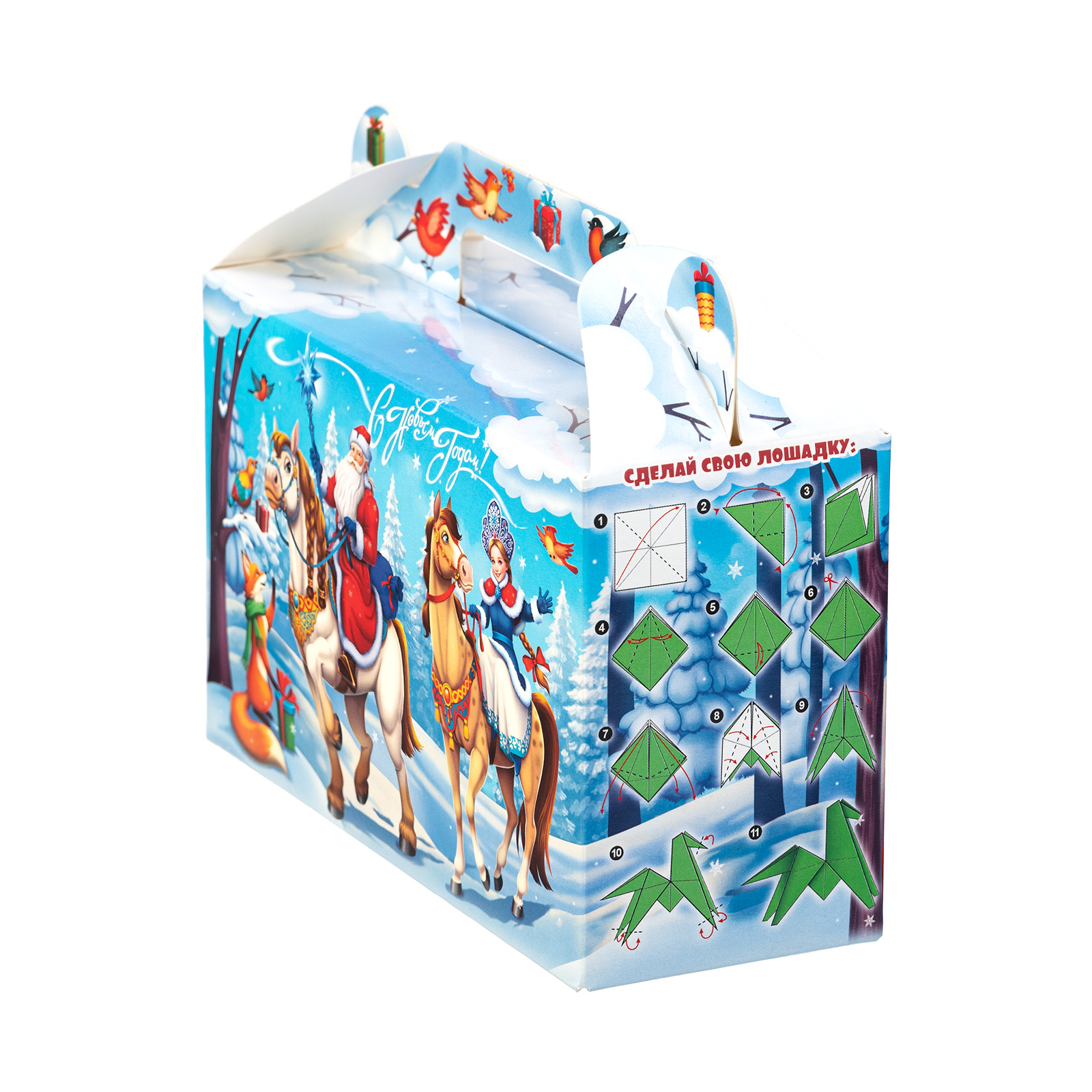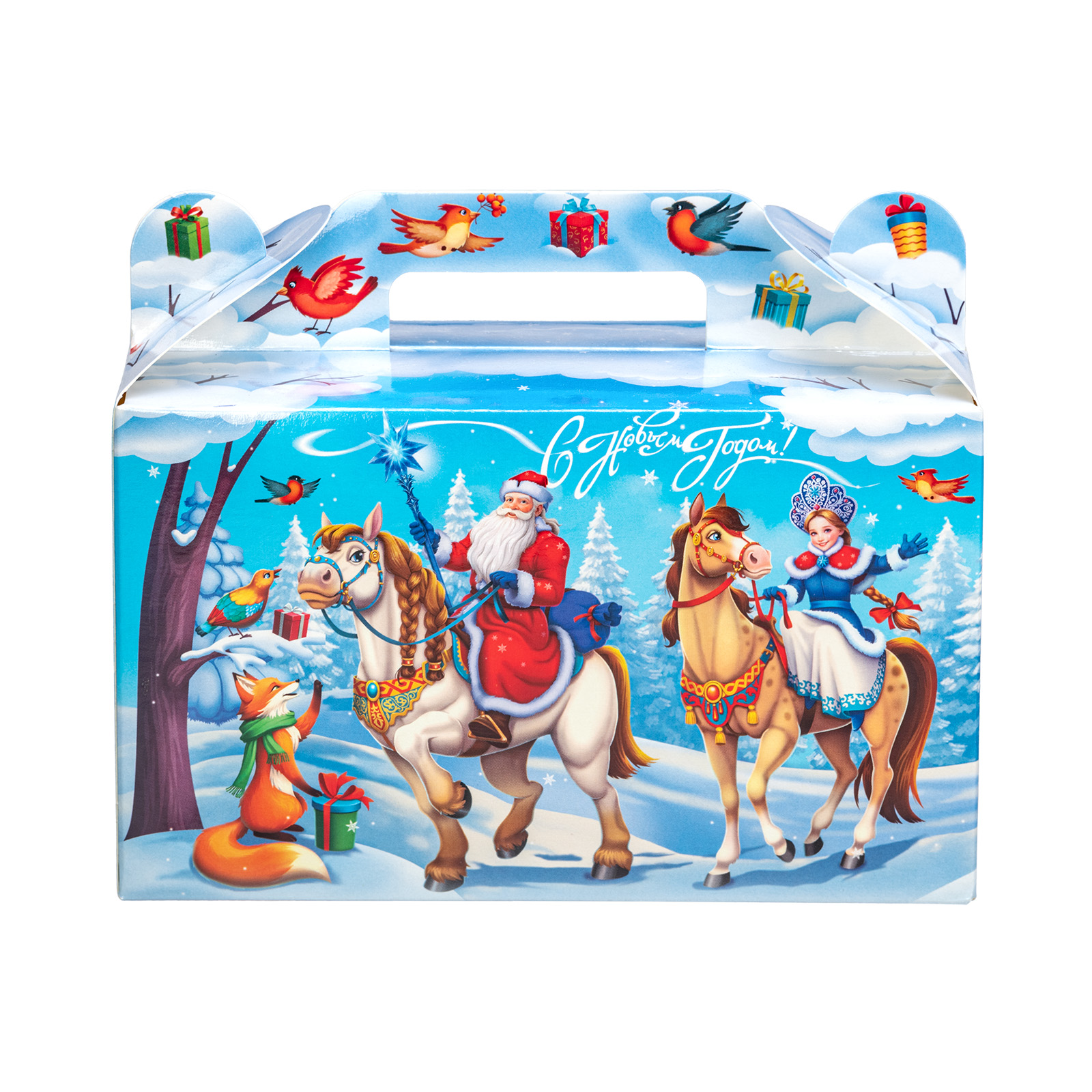 Новогодний сладкий подарок должен быть не только вкусным, но и привлекательным. Именно таким и является подарочный набор “Дружная команда”! Это компактный подарок в традиционной картонной упаковке в форме небольшого чемоданчика. На нежно-голубом фоне изображена картина роскошного снежного леса. На передней части упаковки мы видим главных действующих лиц - Дедушку Мороза, Снегурочку, грациозных лошадок и парочку лесных зверят. Вся дружная компания приветливо смотрит на нас и приглашает присоединиться к праздничному чаепитию с вкусными сладостями, которые бережно хранятся в этом замечательном чудо-сундучке.