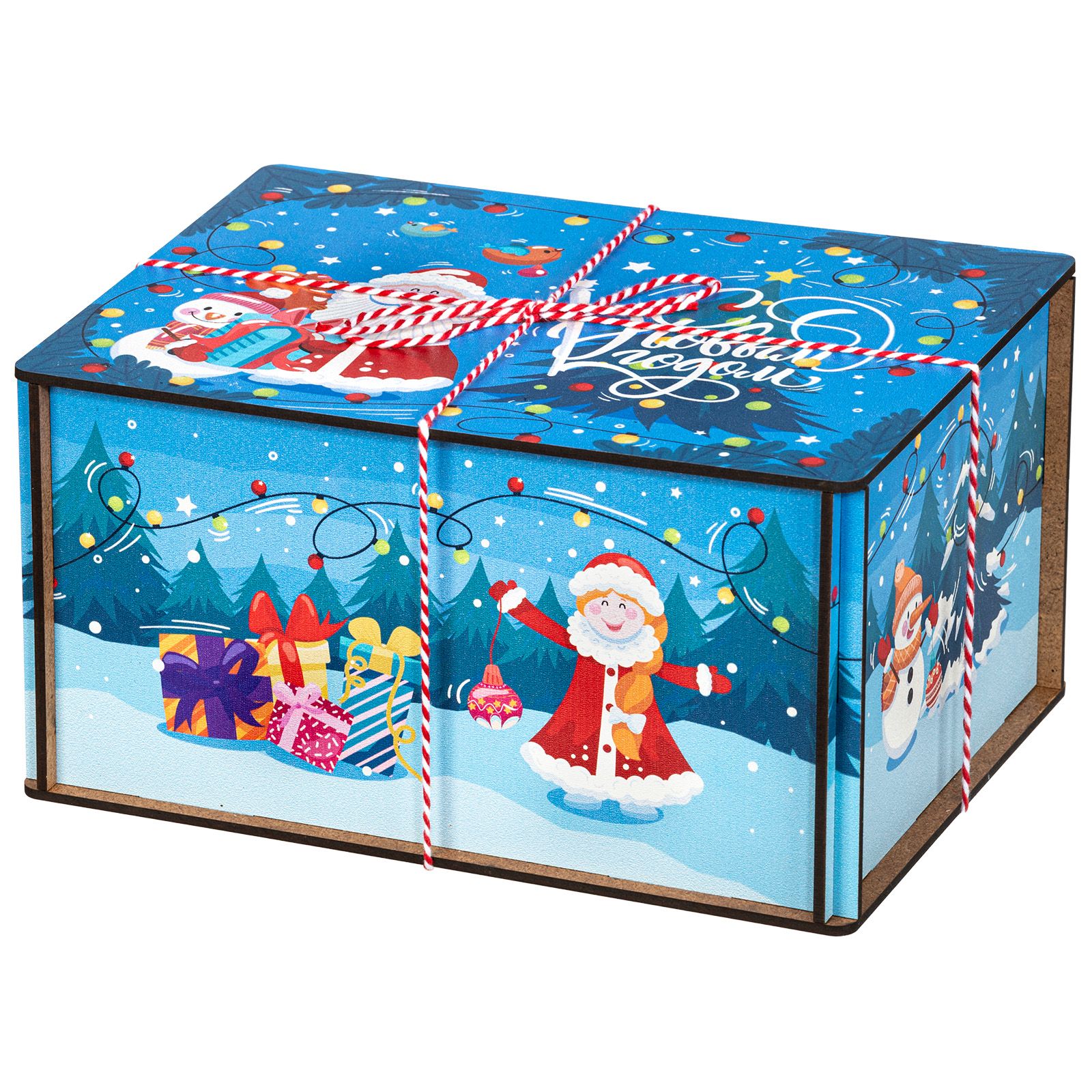 Если вы хотите подобрать интересный подарок для детей, то рекомендуем обратить внимание на презент «Посылка Гирлянды». Данный вариант представлен в упаковке из дерева. Размер короба 21*11*16 сантиметров. Общая цветовая гамма синяя. На рисунке Дедушка Мороз и Снеговичок как главные персонажи праздника. По краям декор их ветвей елок. Сладкое содержимое весом 1000 граммов пестрит разнообразием вкусов и ароматов. В составе есть шоколадные конфеты от легендарных фабрик, новинки от региональных, вкуснейшие десерты, печенье, вафли и многое другое. Отличное сочетание цены, веса и состава.