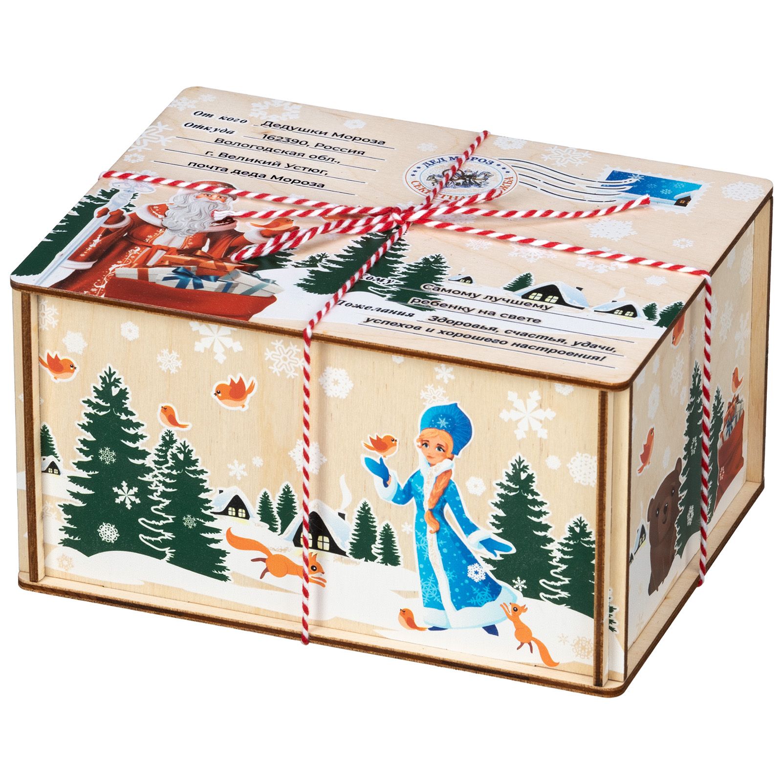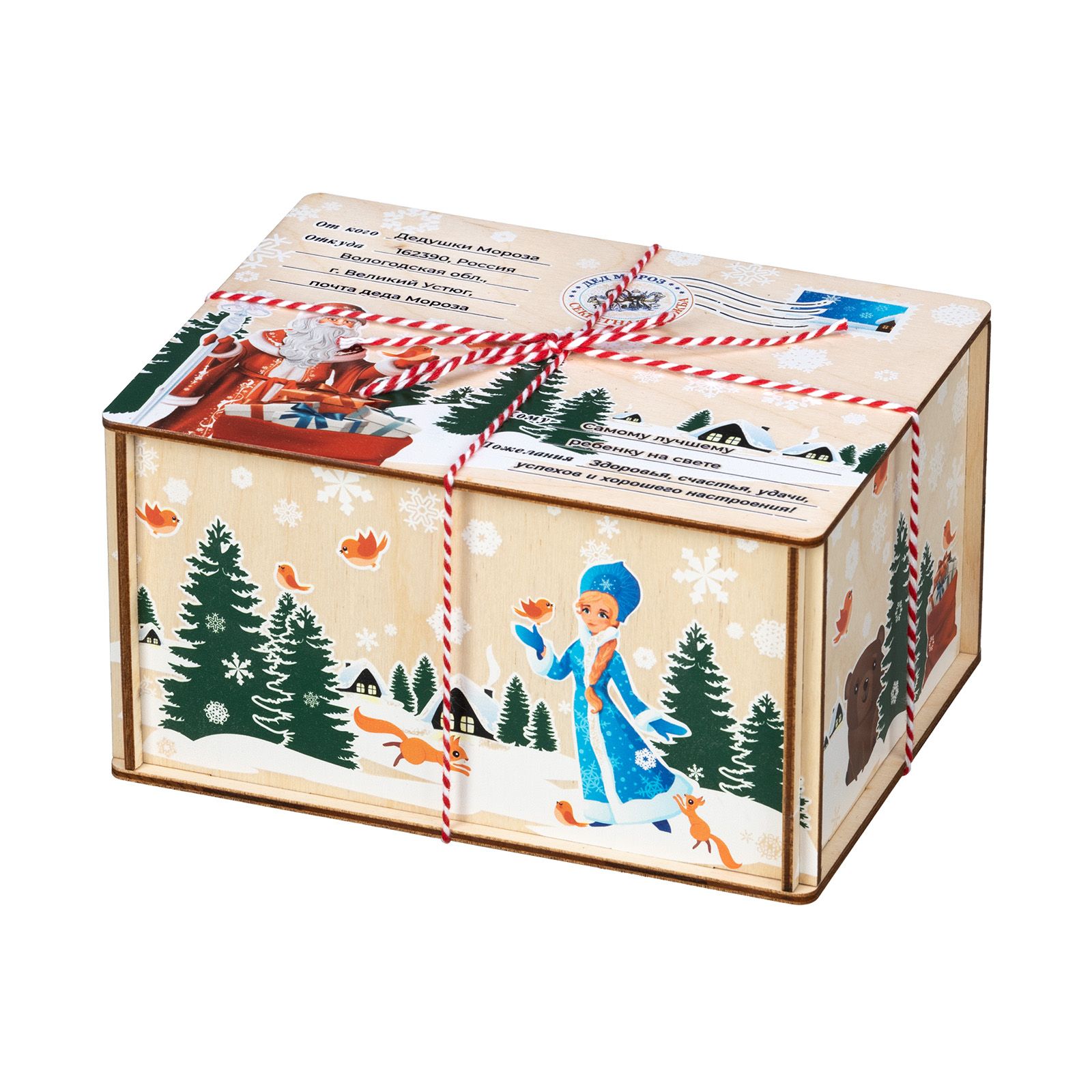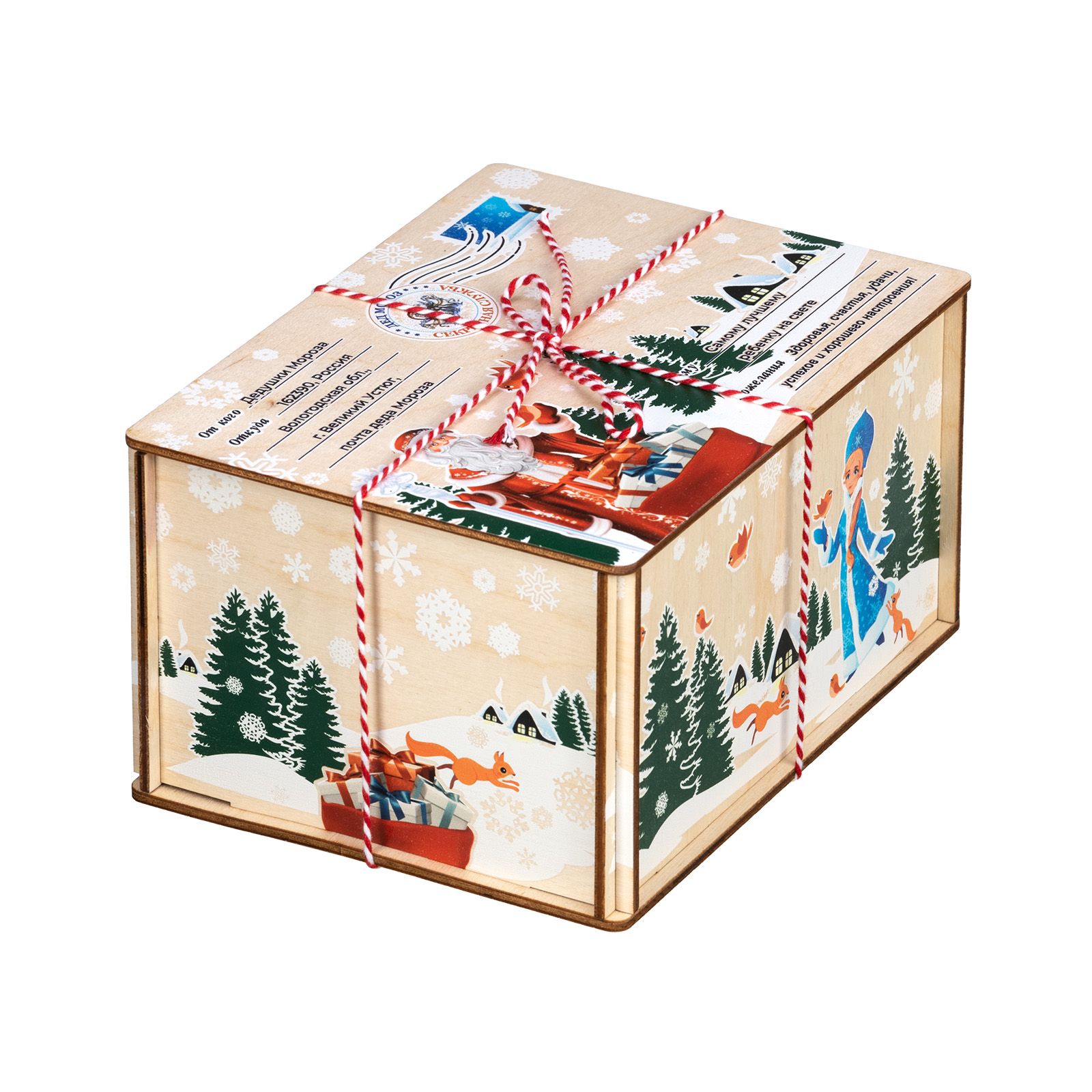 Отличный вариант новогоднего подарка из категории дерево – «Посылка из Детства». Размер деревянной коробочки составляет 18*10*13. Презент представлен в виде почтовой символики на крышке подарка. Также на ней изображен Дедушка Мороз с мешком подарков на лесном фоне. На боковой части подарка изображена внучка Деда Мороза – Снегурочка. Вокруг которой порхают птички и игриво бегают белочки. Внутри подарка разнообразный кондитерский набор весом 600 граммов, который не оставит равнодушным своего получателя. Подарок отлично подойдет мальчишкам, так и девчонкам.