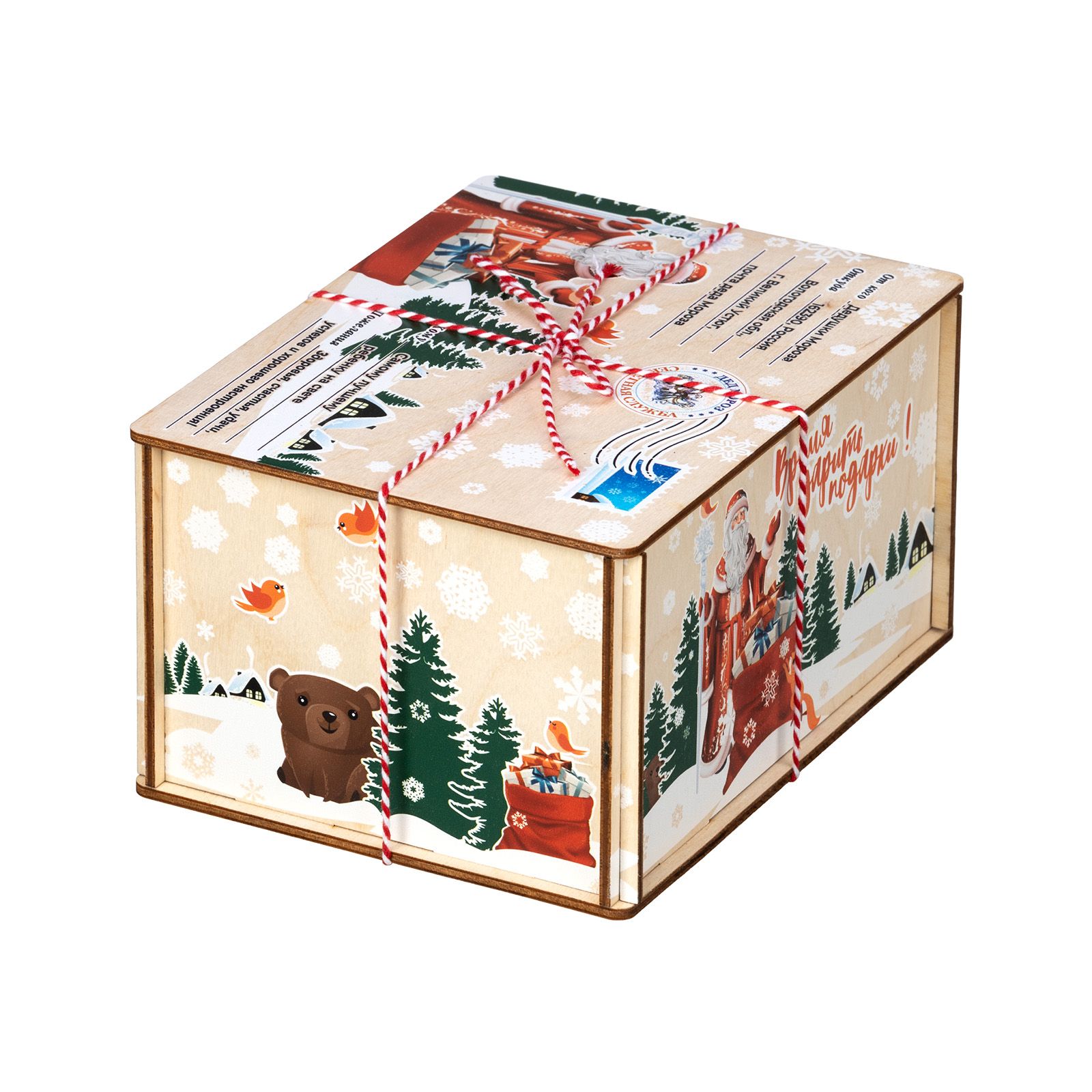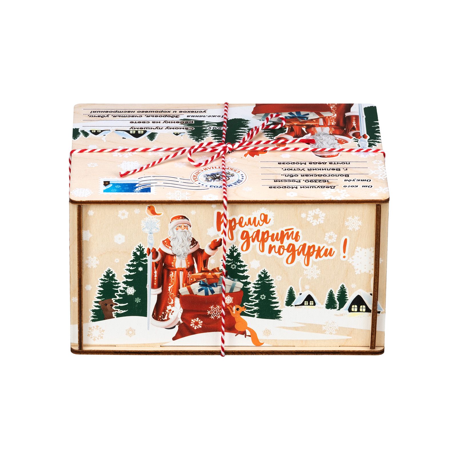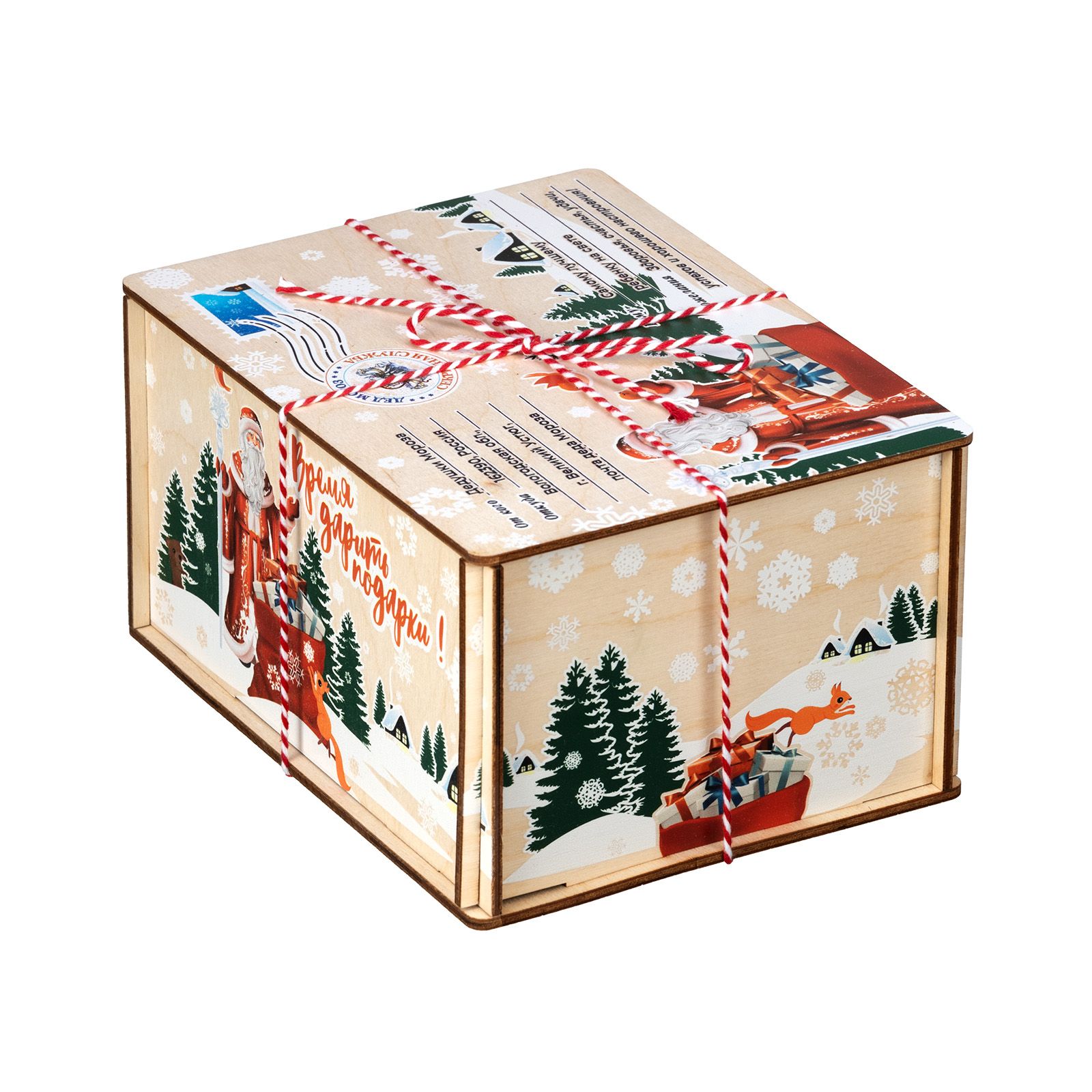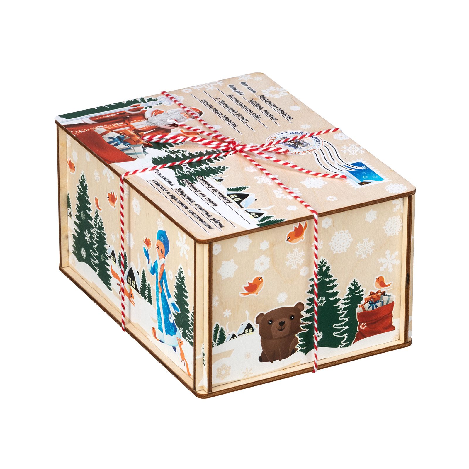 Отличный вариант новогоднего подарка из категории дерево – «Посылка из Детства». Размер деревянной коробочки составляет 18*10*13. Презент представлен в виде почтовой символики на крышке подарка. Также на ней изображен Дедушка Мороз с мешком подарков на лесном фоне. На боковой части подарка изображена внучка Деда Мороза – Снегурочка. Вокруг которой порхают птички и игриво бегают белочки. Внутри подарка разнообразный кондитерский набор весом 600 граммов, который не оставит равнодушным своего получателя. Подарок отлично подойдет мальчишкам, так и девчонкам.